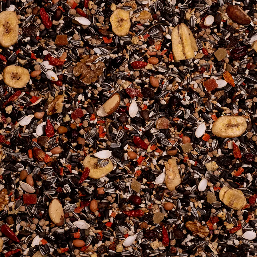 Sjemenke (chia 1 %, kvinoja 1 %), žitarice, voće (grožđice 2 %, šipak 1,5 %, borovice 1 %, banana 1 %, planika 0,8 %, jabuka 0,8 %, ananas 0,8 %, papaja 0,8 %), orašasti plodovi (cedrovi 3 %, kikiriki 1,5 %, orasi 0,8 %, brazilski oraščići 0,8 %), povrće (mrkva 1,5 %, čili papričice 0,8 %), minerali (bird grit 2,5 %), derivati biljnog podrijetla, kvasac, ulja i masti.