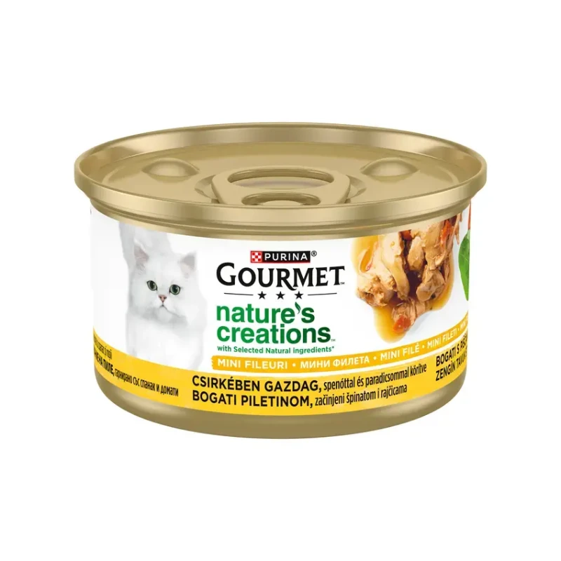 GOURMET Nature’s Creations s piletinom, špinatom i rajčicama donosi prirodno inspiriran recept koji spaja vrhunsku kvalitetu i neodoljiv okus 🌿. Ova mokra hrana sadrži nježne mini filete bogate piletinom, lagano kuhane kako bi sačuvale prirodne hranjive vrijednosti i aromu 🍗