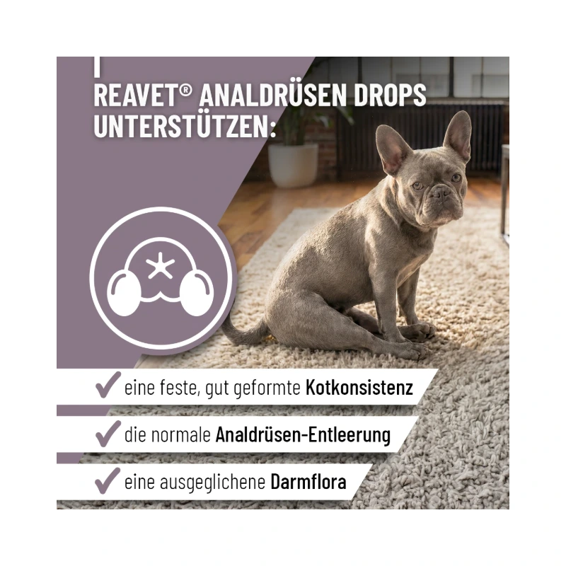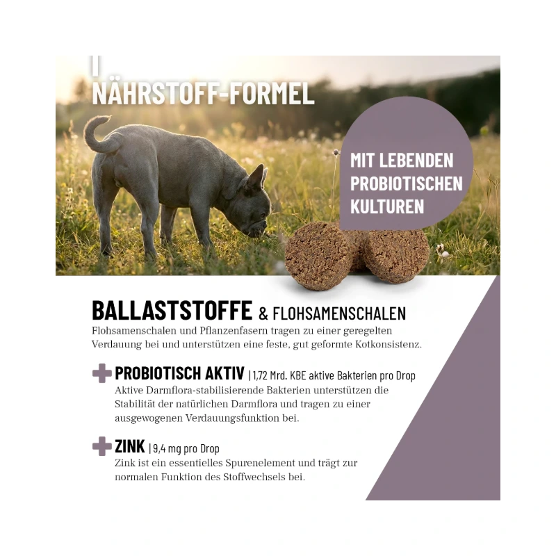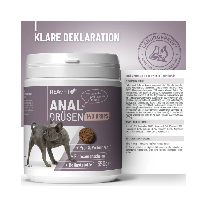 Pravilna konzistencija stolice igra ključnu ulogu u prirodnom pražnjenju analnih žlijezda. Zahvaljujući kombinaciji psyllium ljuskica, prehrambenih vlakana i prebiotičkih biljnih vlakana, ovi dropsi pomažu u postizanju čvršće, stabilne i dobro oblikovane stolice. Dodatno, sadrže žive probiotičke kulture (1,72 milijarde KBE po dropsu) koje podržavaju ravnotežu crijevne flore i opću probavu.