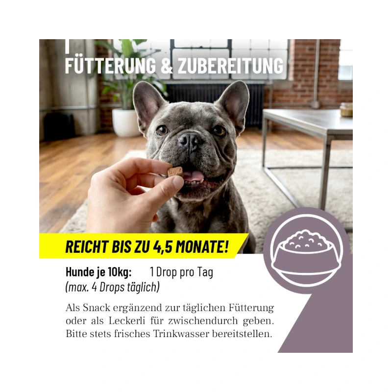 Davati 1 drops na svakih 10 kg tjelesne težine psa dnevno, maksimalno 4 dropsa dnevno.